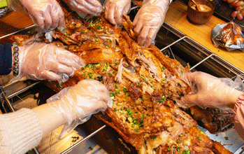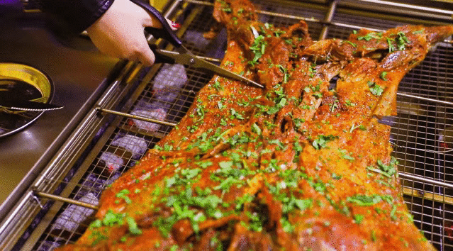 首先用剪刀要把烤全羊进行切分,方便大家撕开,分享食用
