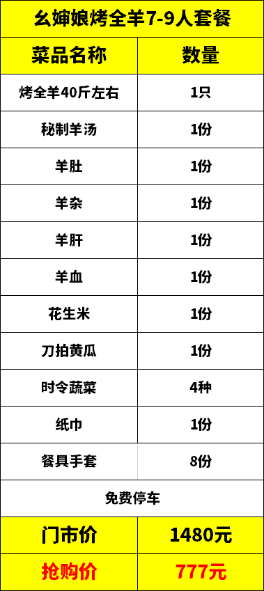 龙阳大道丨外酥里嫩~鲜嫩多汁~仅777元抢门市价1480元「幺婶娘烤全羊」套餐=烤全羊1只40斤左右+秘制羊汤+羊肚+羊杂+羊肝+羊血+花生米+刀拍黄瓜+时令蔬菜+免费停车+纸巾+餐具手套 7-9人套